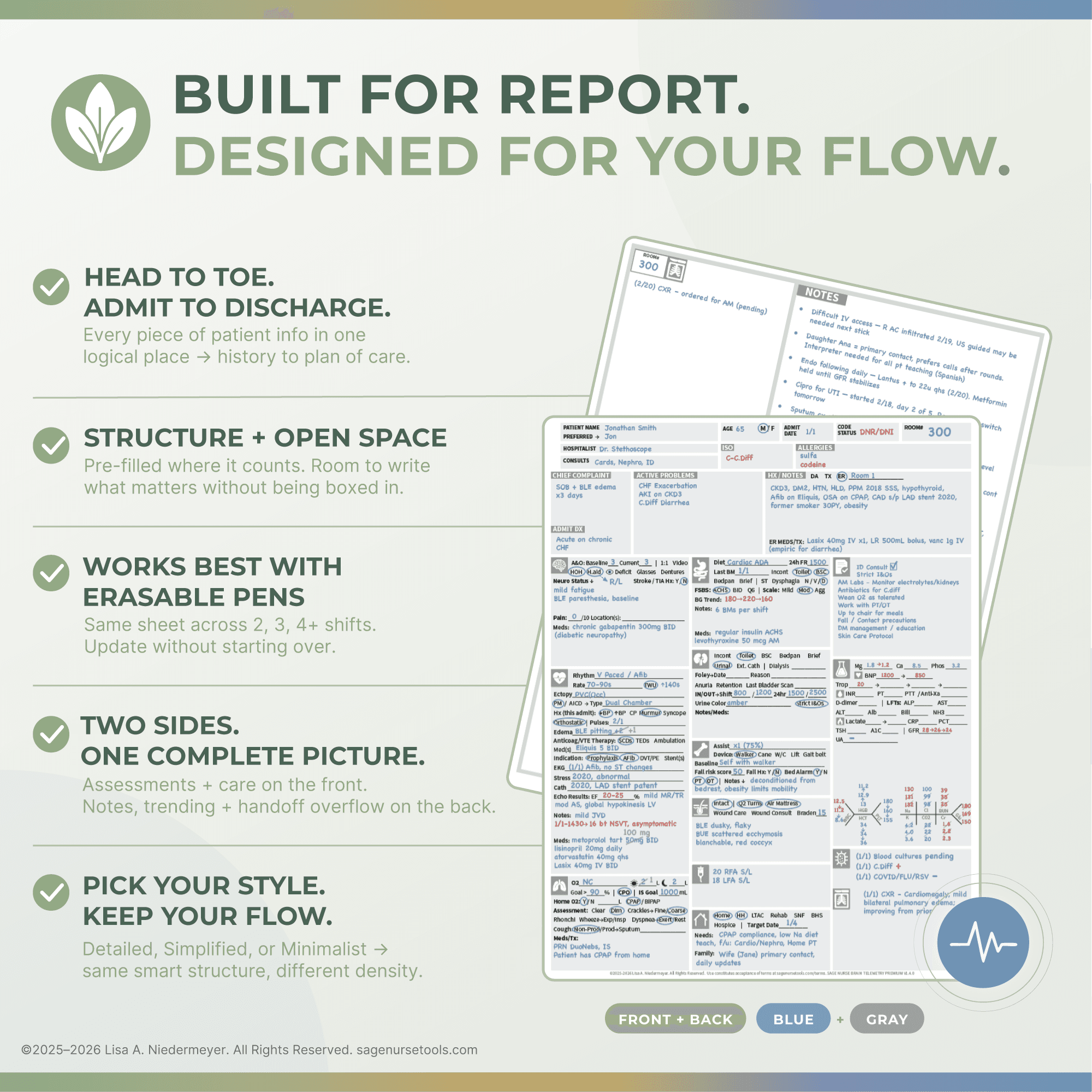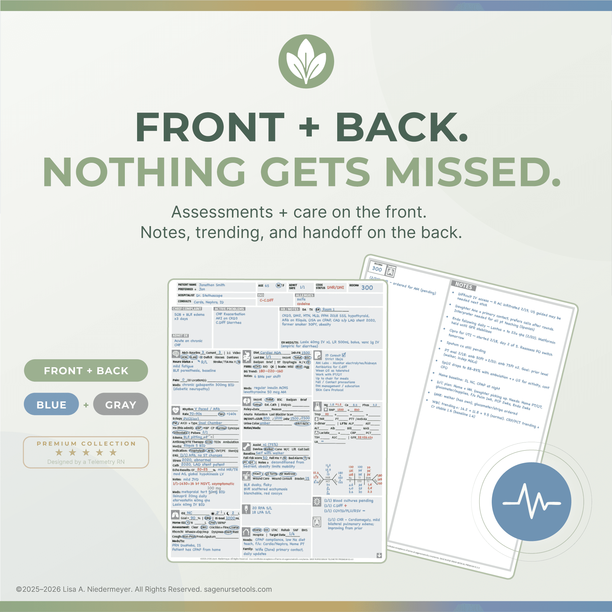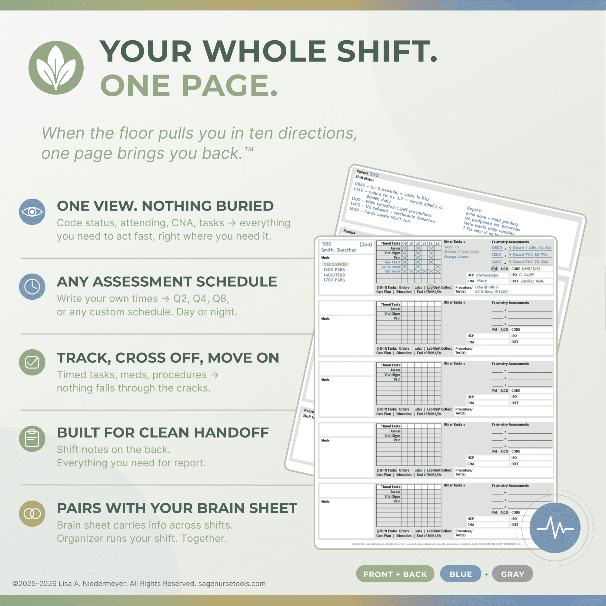 Track every patient across your shift. Front + back, blue and gray.
