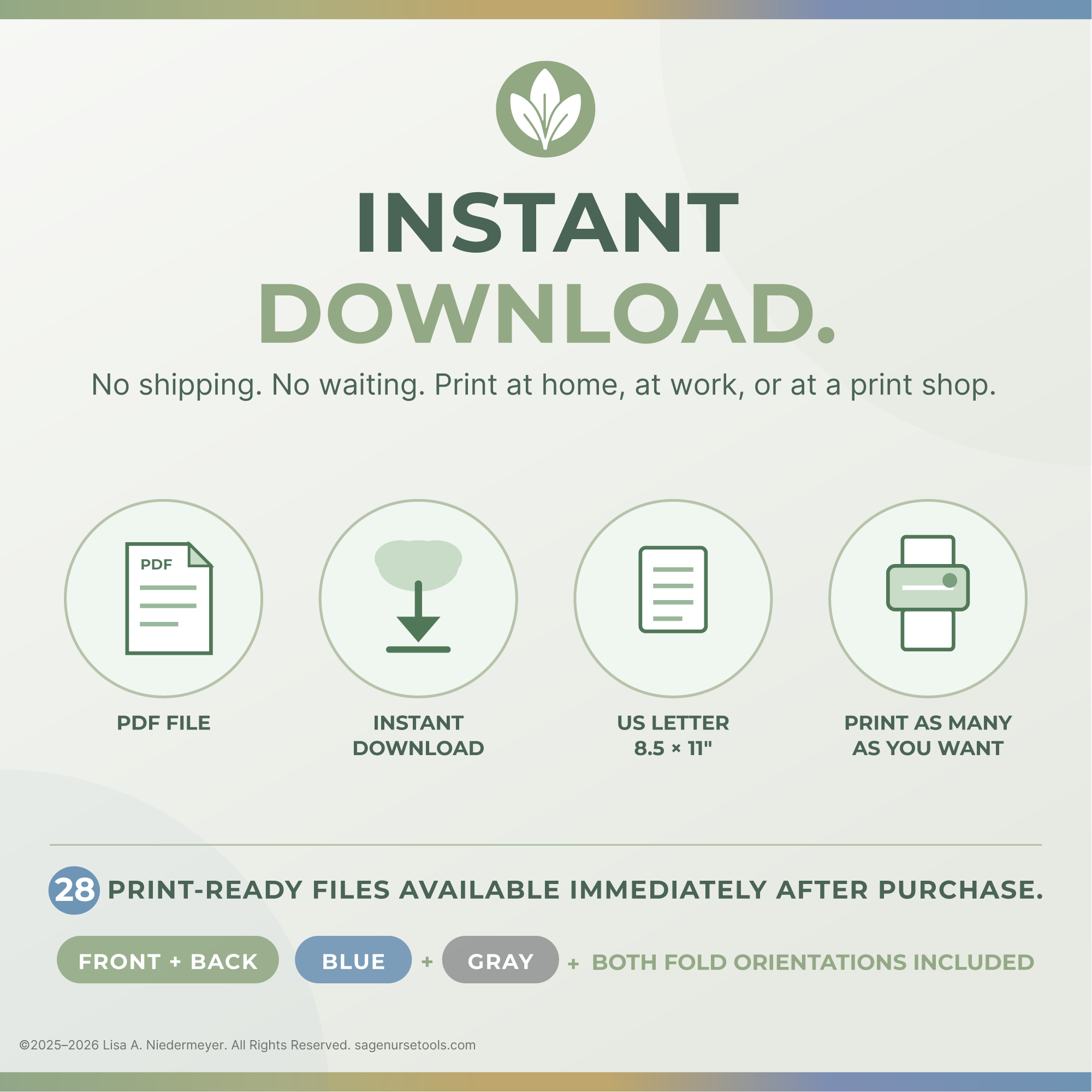 Print specs:PDF format, 8.5 × 11" US Letter. Print at home, at work, or at a print shop. Both blue and gray versions print cleanly in black and white.
